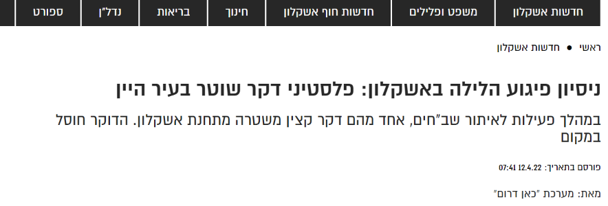 על פי דיווח כלי התקשורת הישראלים עבדאללה תייסיר סרסור נהרג תוך שניסה לדקור שוטר ברחוב דרך היין, אשקלון, אמש- ה12.04.2022