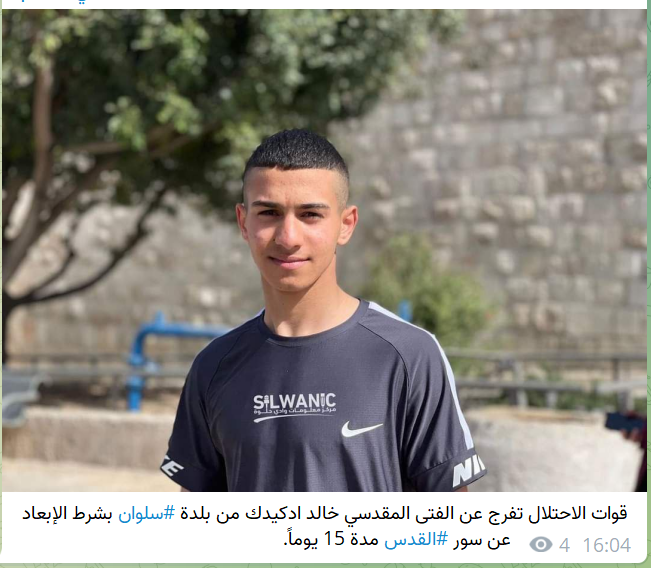 כוחות הכיבוש שחררו את הירושלמי חאלד אדקידק מהעיירה סילוואן בתנאי שיורחק מחומת ירושלים לתקופה של 15 ימים.