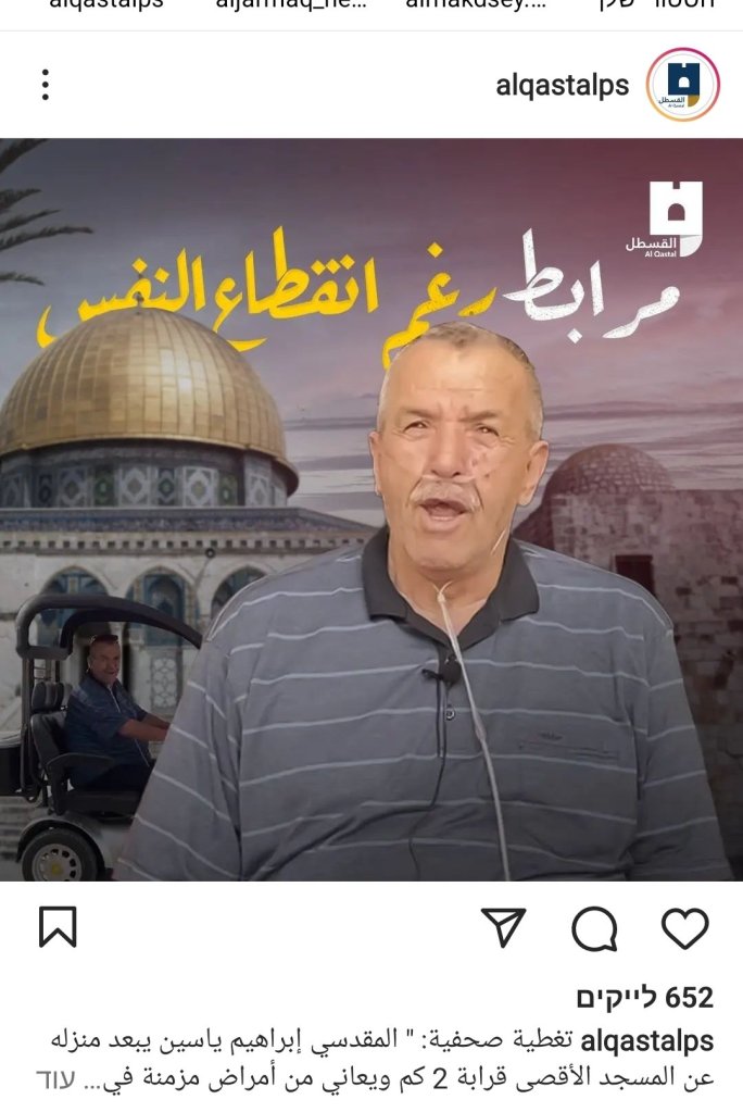 “Al-Maqdisi Ibrahim Yassin, his house is located about 2 km from Al-Aqsa Mosque and he suffers from chronic diseases of the respiratory system.