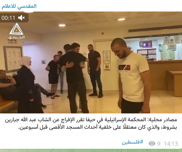 Local sources: The Israeli court in Haifa decided to conditionally release the young man, Abdullah Jabarin, who was detained in connection with the Al-Aqsa Mosque events two weeks ago.