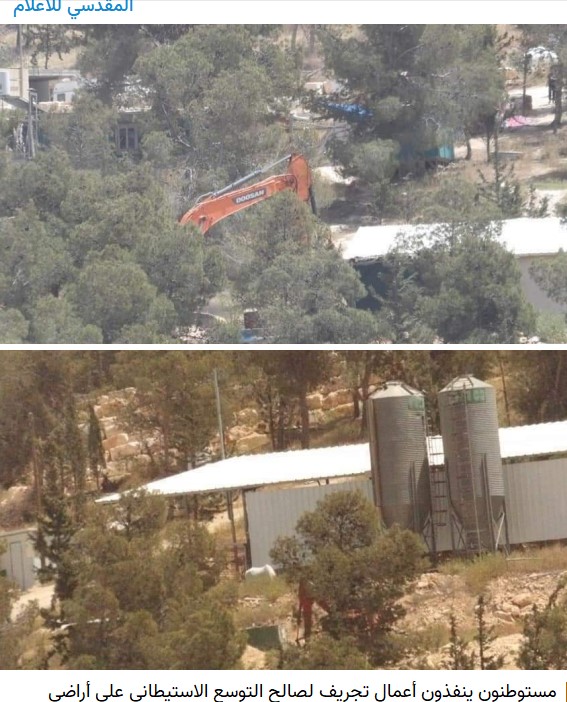 Settlers carry out razing works in favor of settlement expansion on Al-Tawana lands south of Hebron.