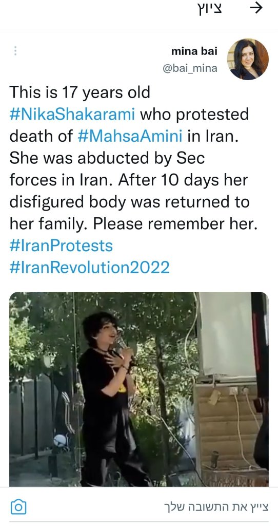 This is 17 years old #NikaShakarami who protested death of #MahsaAmini in Iran. She was abducted by Sec forces in Iran. After 10 days her disfigured body was returned to her family. Please remember her.