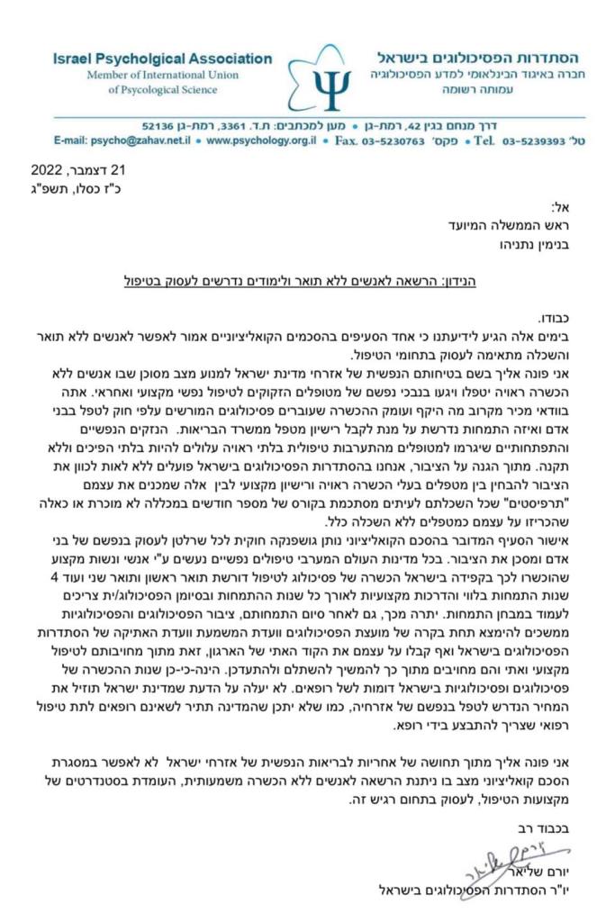 אחד הסעיפים בהסכמים הקואליציוניים המתהווים לממשלה הבאה עלול לאפשר לאנשים ללא הסמכה והכשרה לעסוק במקצועות הטיפול