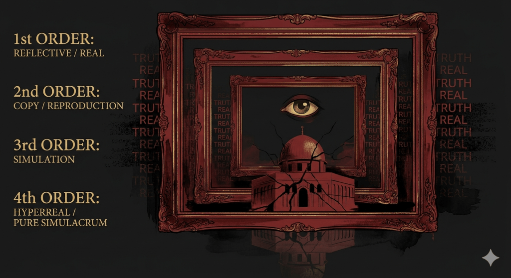 Iranian propaganda frequently operates at the third and fourth orders of simulacra — masking absences or generating self-sustaining illusions detached from reality — fostering epistemic confusion in which citizens and observers struggle to discern truth amid simulated spectacles.